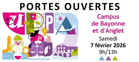 Portes ouvertes 2026Participez aux portes ouvertes sur les campus de Bayonne et d'Anglet et rencontrez des enseignants, des enseignants-chercheurs, des étudiants et des animateurs de la vie étudiante., visitez des locaux et assistez à une présentation des diplômes. Lire la suite
